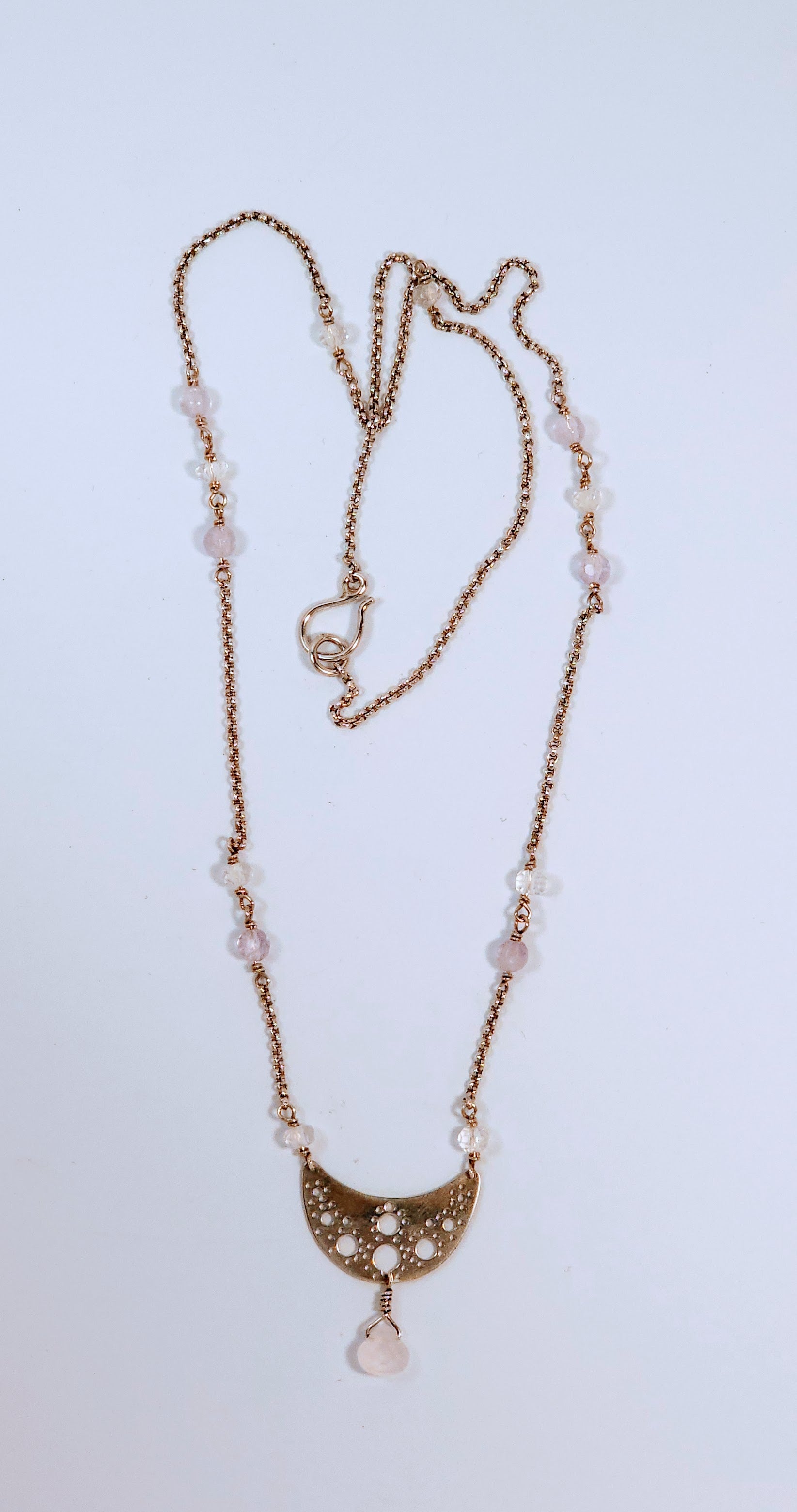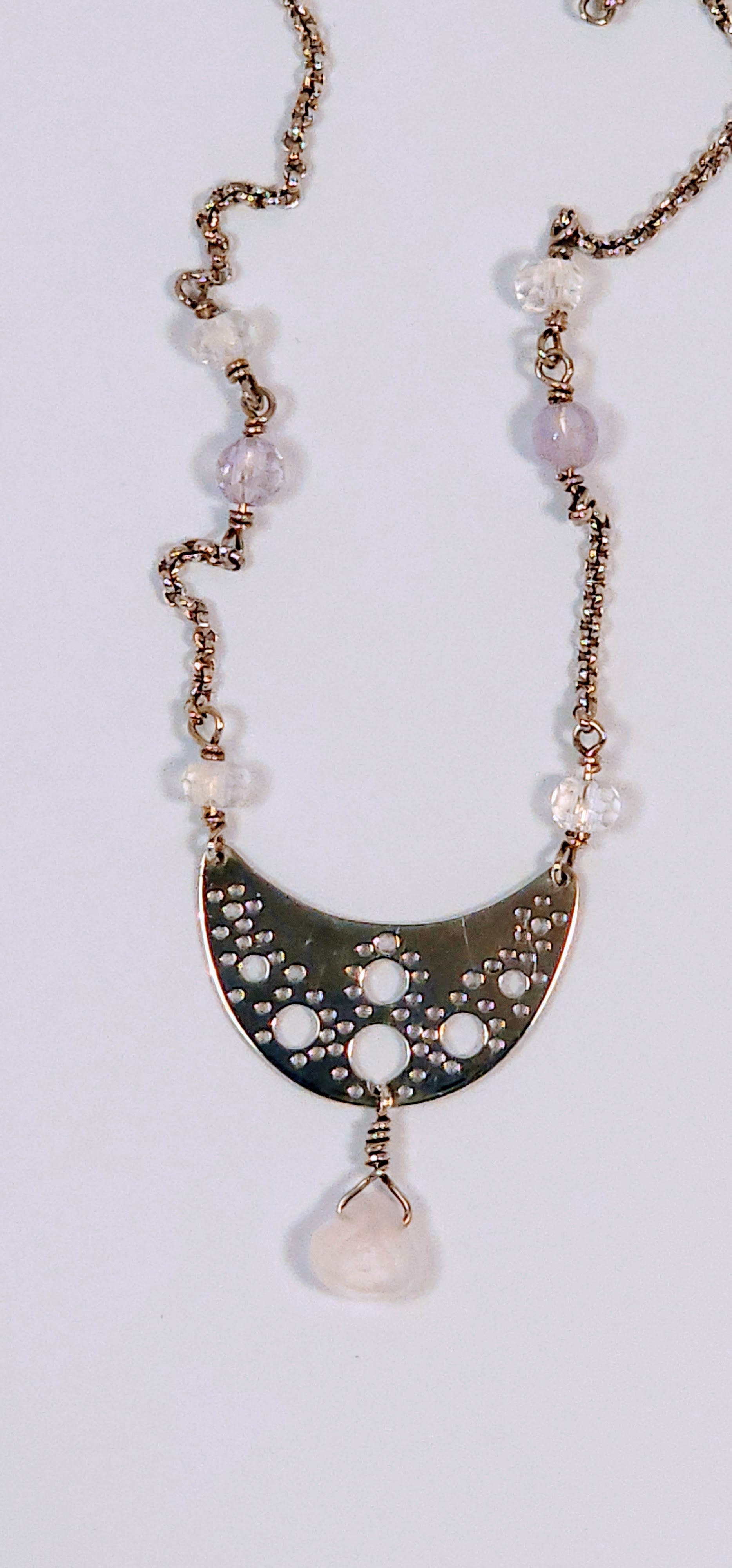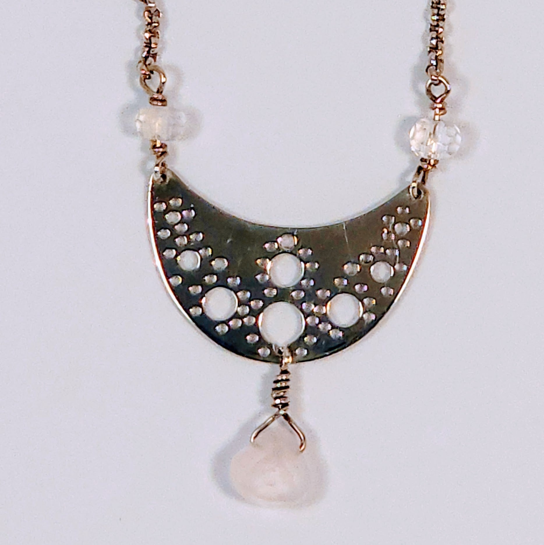Expertly crafted by hand, Luna is a stunning silver necklace adorned with rose quartz and sparkling crystals. Its intricate half moon lace shield design exudes elegance and sophistication. Elevate any outfit with the natural beauty and positive energy of Luna.